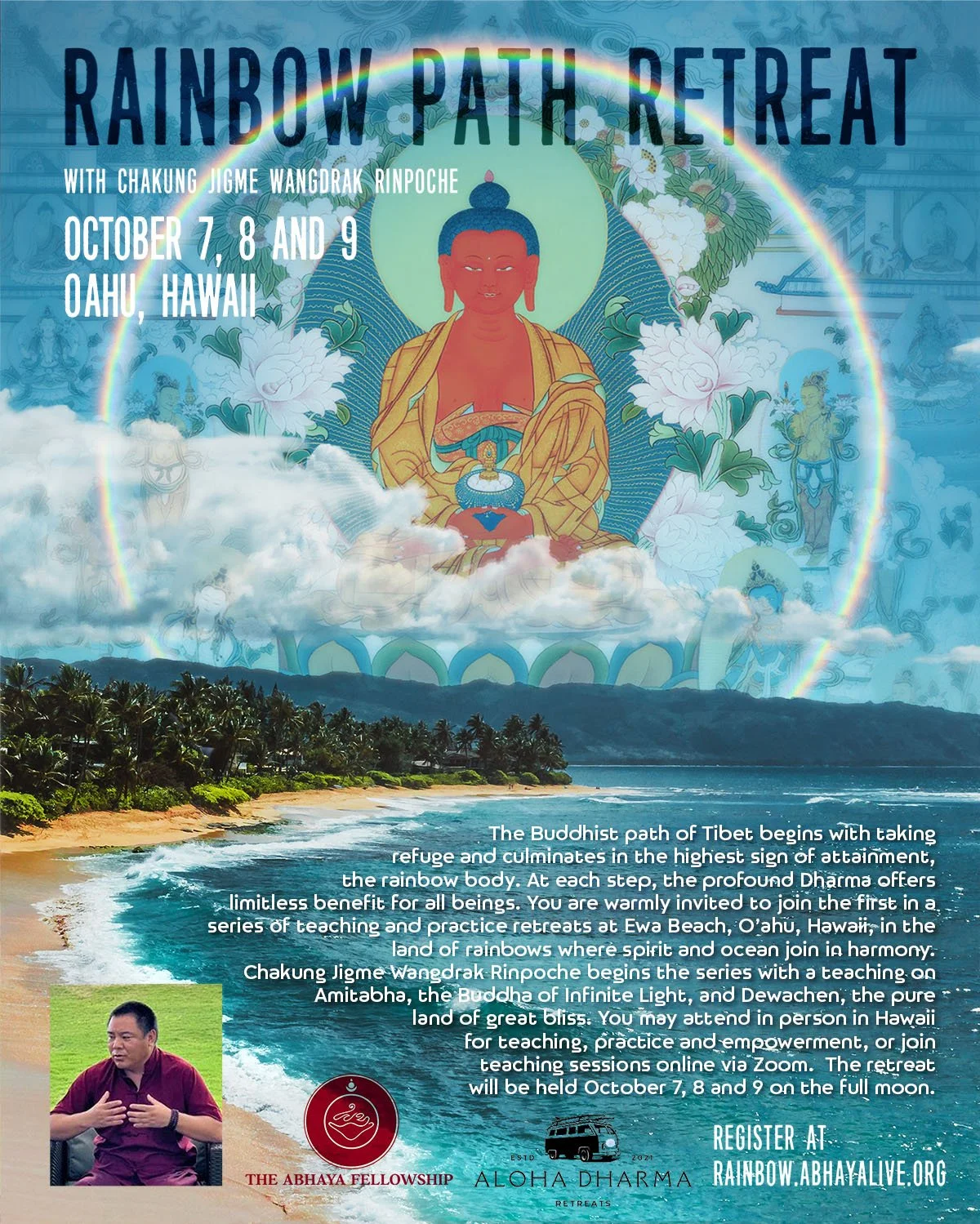 The Buddhist path of Tibet begins with taking refuge and culminates in the highest sign of attainment, the rainbow body. At each step, the profound dharma offers limitless benefit for all beings. You are warmly invited to join the first in a series of teaching and practice retreats at Ewa Beach, O’ahu, Hawaii, the land of rainbows where spirit and ocean join in harmony. Tulku Jigme Wangdrak Rinpoche will begin the series with a teaching on Amitabha, the Buddha of Infinite Light, and Dewachen, the pure land of great bliss.